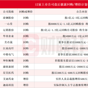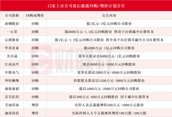 截至发稿,据不完全统计,盘后包括凌钢股份、一心堂、辽港股份、华英农业、美芯晟、江南高纤、中熔电气、坤恒顺维、康欣新材、星昊医药、艾迪药业、迦南科技在内的12家A股上市公司披露回购或增持计划公告。具体来看,10家上市公司披露回购计划公告。其中,辽港股份拟1亿元-1.2亿元回购公司股份,本次回购的股份将全部予以注销并减少公司注册资本。此外,2家上市公司披露增持计划公告。其中,艾迪药业实控人及总裁拟增持500万元-1000万元股份。