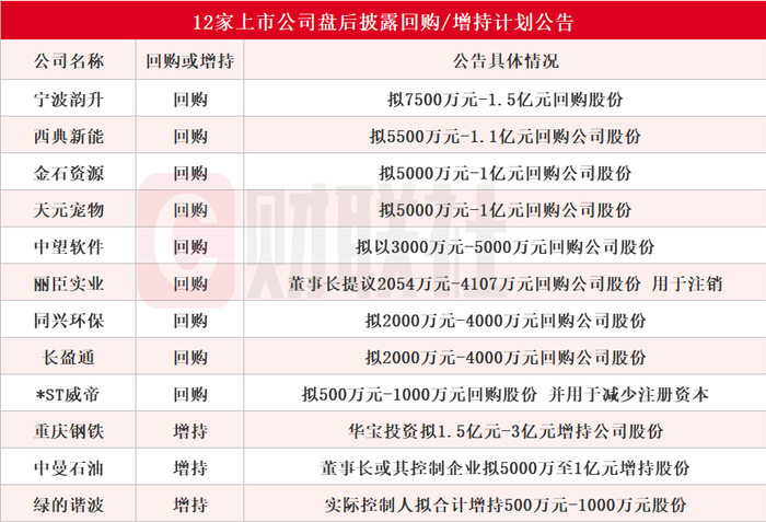 截至发稿,据不完全统计,盘后包括宁波韵升、西典新能、金石资源、天元宠物、中望软件、丽臣实业、同兴环保、长盈通、*ST威帝、重庆钢铁、中曼石油和绿的谐波在内的12家A股上市公司披露回购或增持计划公告。具体来看,9家上市公司披露回购计划公告。其中,丽臣实业公告,董事长提议2054万元-4107万元回购公司股份并注销。*ST威帝公告,拟500万元-1000万元回购股份,用于减少公司注册资本。同时,3家上市公司披露增持计划公告。其中,重庆钢铁公告,华宝投资拟1.5亿元-3亿元增持公司股份。