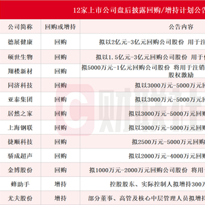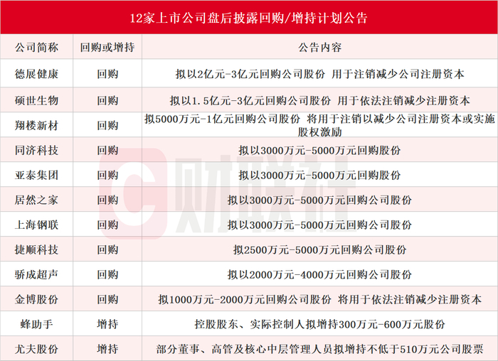 截至发稿,据不完全统计,盘后包括德展健康、硕世生物、翔楼新材、同济科技、亚泰集团、居然之家、上海钢联、捷顺科技、骄成超声、金博股份、蜂助手、尤夫股份在内的12家A股上市公司披露回购或增持计划公告。具体来看,10家上市公司披露回购计划公告。其中,德展健康和硕世生物拟最高3亿元回购股份,均用于注销并减少公司注册资本。2家上市公司披露增持计划公告,其中,蜂助手控股股东、实际控制人拟增持300万元-600万元股份。