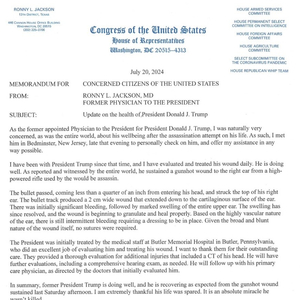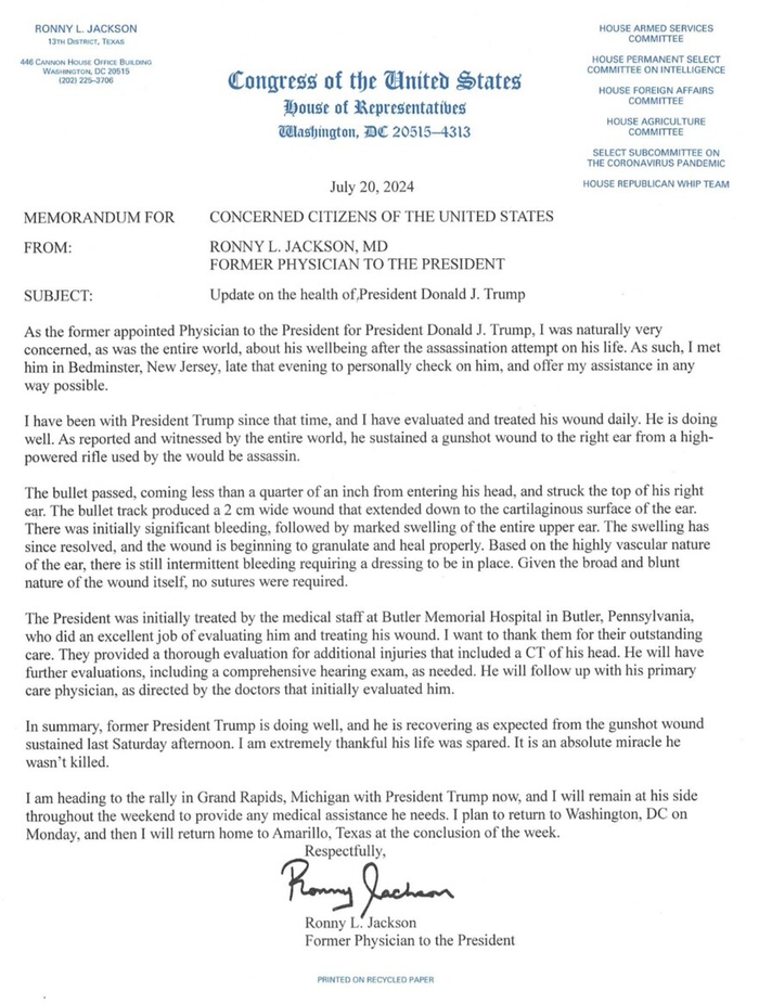 美国前总统特朗普在社交媒体平台上刊出他在白宫时期的个人医生罗尼·杰克逊的信件。杰克逊表示,他从刺杀事件发生那天晚上开始,便一直与特朗普在一起,每天评估和治疗他的伤口。