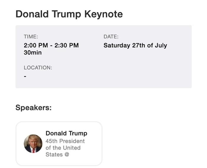 美国前总统唐纳德·特朗普定于当地时间周六(北京时间周日凌晨3点)出席在纳什维尔举行的比特币会议。这位共和党候选人此前曾称加密货币是“即将发生的灾难”,他在出席会议时将发表演讲,内容是“共和党人将结束民主党人对加密货币的非法和非美国镇压”。