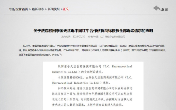 中国红牛发布声明:经销商不涉商标侵权,法院驳回泰国天丝全部诉讼请求 媒体滚动 2024.07.30 17:13 7月30日,中国红牛在官方渠道发布声明称,长沙中院(2021)湘01民初564号民事判决书7月29日已驳回泰国天丝起诉中国红牛长沙经销商华厦糖酒公司商标侵权的全部诉讼请求。