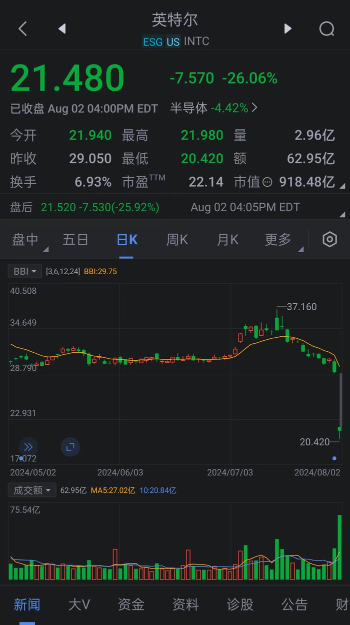 英特尔(INTC)收跌26.06%,报21.48美元。