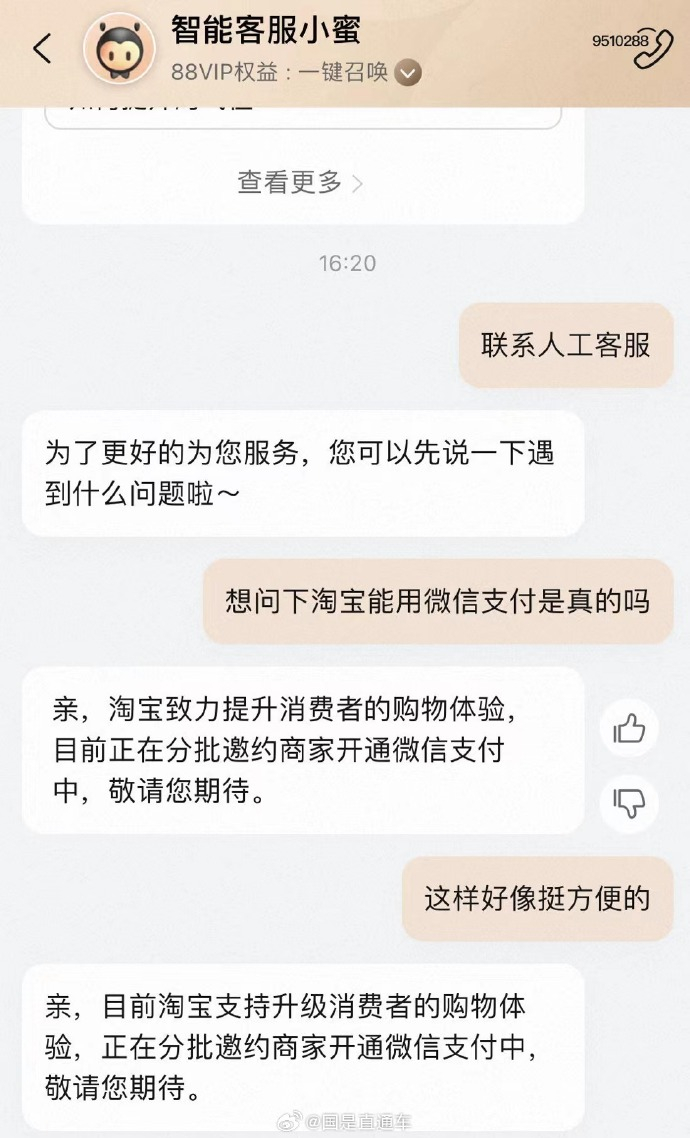 88VIP称正分批邀商家开通微信支付 媒体滚动 2024.09.04 16:34 9月4日,#淘宝即将全面支持微信支付#登上热搜。国是直通车联系了淘宝88VIP的专属客服询问是否将引入微信支付。客服回应称,淘宝致力提升消费者的购物体验,目前正在分批邀约商家开通微信支付中。
