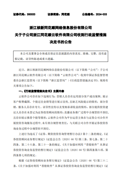 同花顺公告,子公司云软件公司收到中国证券监督管理委员会浙江监管局《行政监管措施决定书》。云软件公司存在营销人员运用部分客户成功案例、展示客户称赞截图、个股过往业绩等进行展示宣传且缺乏风险提示的情形;部分营销、服务人员存在夸大、误导性宣传以及变相承诺收益的情形;部分提供投资建议人员存在未登记为证券投资顾问的情形;直播业务推广过程中合规管控不到位且存在暗示推荐个股等情形;云软件公司作为平台运营主体在与证券公司合作开展投资咨询服务过程中未尽到合规管理责任;与关联公司合作开展证券投资咨询业务过程中合规管控不到位。浙江监管局决定对云软件公司采取责令改正、责令暂停新增客户的行政监督管理措施,整改及暂停期限为3个月。