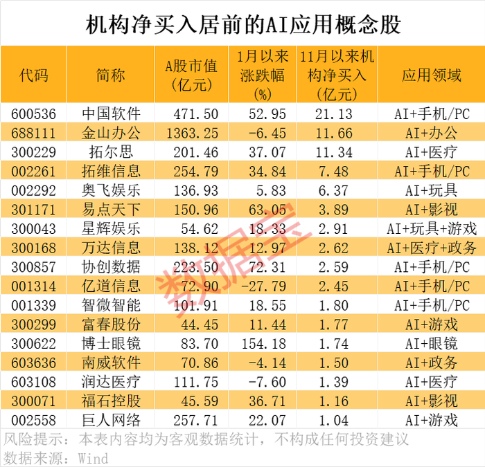 根据上市公司公告、互动平台、券商研报等内容,梳理出A股市场已布局上述领域的AI应用概念股。梳理发现,共计122股入围,截至11月29日收盘,概念股合计A股市值达到3.69万亿元人民币(下同)。9只概念股A股市值超过千亿元,包括东方财富、迈瑞医疗、海光信息、同花顺、爱尔眼科等。资金面上,近期部分AI应用概念股受到机构资金青睐。据统计,11月以来机构净买入超亿元的概念股有17只。机构净买入额最高的是中国软件,达到21.13亿元;其次是金山办公、拓尔思、拓维信息、奥飞娱乐等。(证券时报)