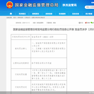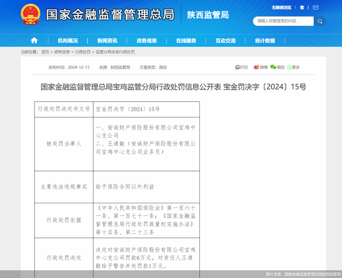 12月13日,国家金融监督管理总局陕西监管局发布行政处罚信息显示,安诚财产保险股份有限公司宝鸡中心支公司,因给予保险合同以外利益,被罚款6万元。安诚财产保险股份有限公司宝鸡中心支公司业务员,被警告并罚款1万元。