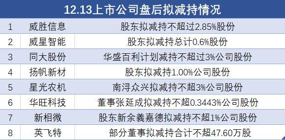 12月13日上市公司减持汇总 媒体滚动 2024.12.13 22:07 据统计,12月13日,截至发稿,盘后包括威胜信息、威星智能、同大股份、扬帆新材、星光农机、华旺科技、新相微、英飞特在内的8家A股上市公司披露减持情况。