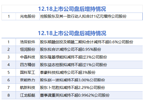 12月18日增减持汇总 媒体滚动 2024.12.18 22:22 据统计,12月18日,截至发稿,光电股份盘后披露增持情况。包括浩辰软件、恒润股份、中晶科技、四方精创、国科军工、京能热力、航新科技、江龙船艇在内的8家A股上市公司披露减持情况。