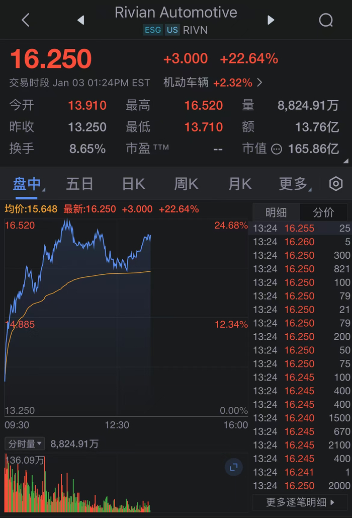 RIVIAN股价创五个月新高,涨超22%。消息面上,公司第四季度交付量为1418... 媒体滚动 2025.01.04 02:17 RIVIAN股价创五个月新高,涨超22%。消息面上,公司第四季度交付量为14183辆汽车,市场预期13402辆。
