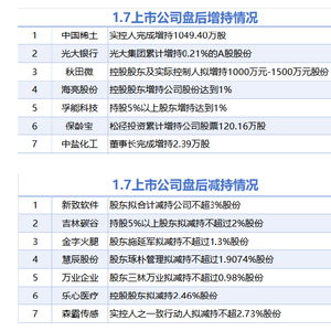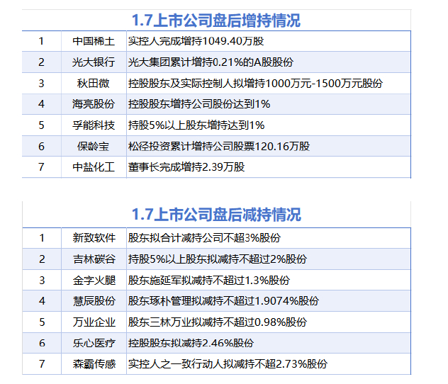 1月7日增减持汇总(表) 媒体滚动 2025.01.07 22:31 据统计,1月7日,盘后包括中国稀土、光大银行、秋田微、中盐化工在内的7家A股上市公司披露增持情况。包括新致软件、吉林碳谷、金字火腿在内的7家A股上市公司披露减持情况。