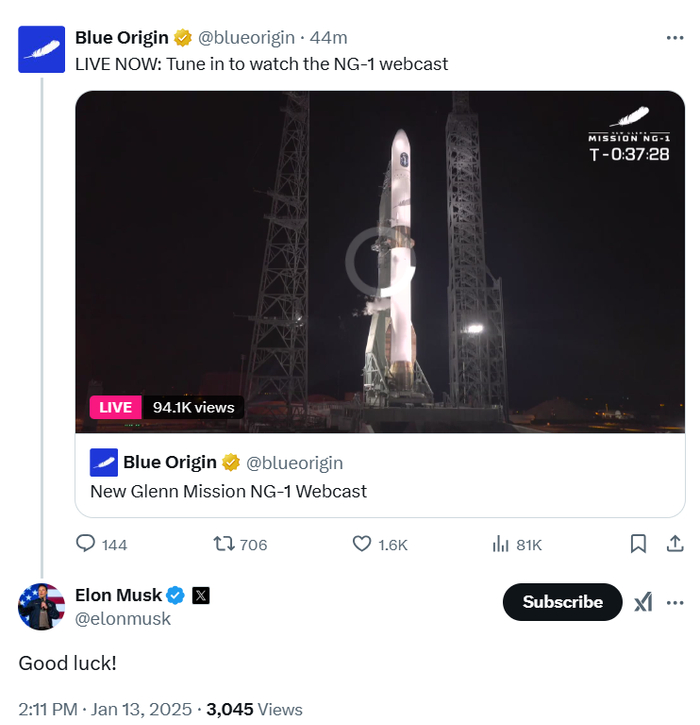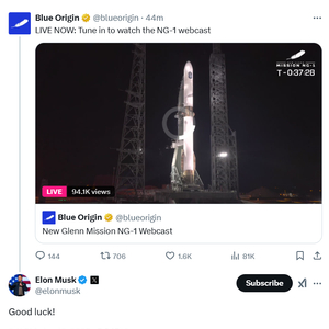 SpaceX竞争对手蓝色起源在社交媒体平台“X”直播“新格伦”重型运载火箭首飞,马斯克表示祝其好运。