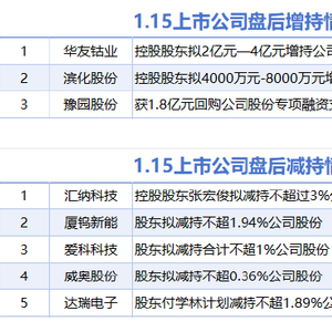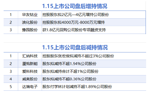 1月15日增减持汇总 媒体滚动 2025.01.15 22:10 据统计,1月15日,盘后包括华友钴业、滨化股份、豫园股份在内的3家A股上市公司披露增持情况。包括汇纳科技、厦钨新能、爱科科技、威奥股份、达瑞电子在内的5家A股上市公司披露减持情况。