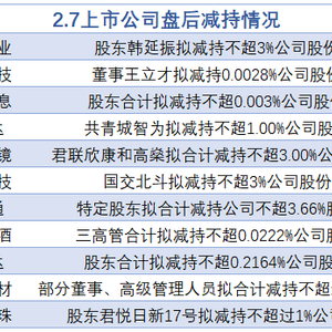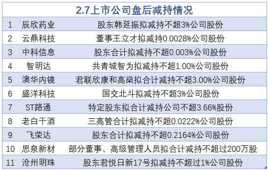 2月7日增减持汇总 媒体滚动 2025.02.07 22:04 据统计,2月7日盘后,包括辰欣药业、云鼎科技、中科信息、智明达、澳华内镜、盛洋科技、ST路通、老白干酒、飞荣达、思泉新材、沧州明珠在内的11家A股上市公司披露拟减持情况。当日无A股上市公司披露拟增持情况。