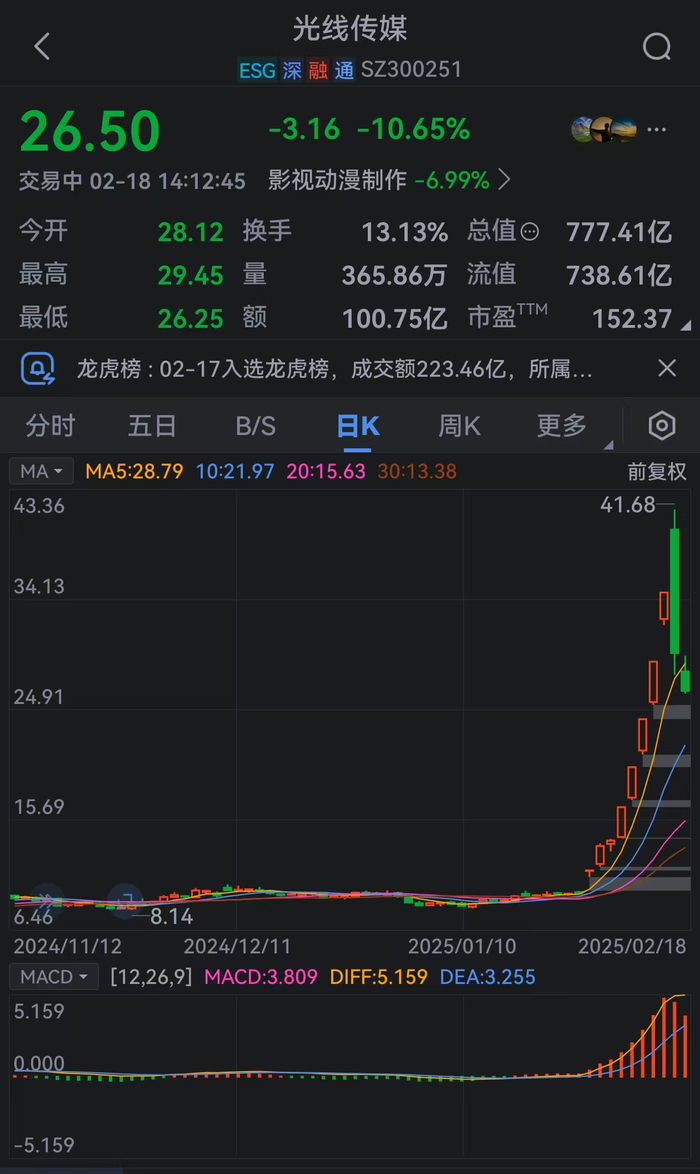 光线传媒盘中跌超10%
