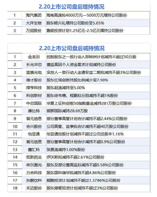 据统计,2月20日,盘后海汽集团、大洋生物、万润股份在内的3家A股上市公司披露增持情况。包括金龙羽、长光华芯、蓝盾光电、德才股份、绿亨科技、科创新材、中芯国际、康比特、普元信息、合兴股份、怡亚通、普元信息、鑫汇科、拓新药业、帝尔激光、力合科技、东鹏饮料、禾迈股份在内的18家A股上市公司披露减持情况。