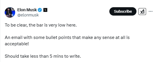马斯克隔空喊话:邮件要求很低 应该不超过5分钟就能写完