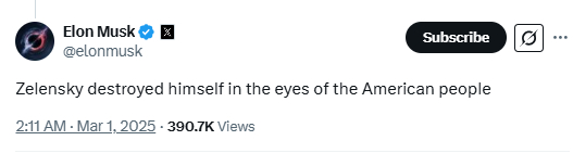 美国总统特朗普2月28日与到访白宫的乌克兰总统泽连斯基在媒体前爆发激烈争吵,泽连斯基提前离开白宫。当地时间28日晚些时候,马斯克在社交平台X上对美乌领导人会晤一幕发表评论。美国共和党众议员托马斯·马西转发关于特朗普与泽连斯基会晤帖文称,“泽连斯基的总统任期就此结束了吗?他寄希望于(美国前总统)拜登和‘深层政府’。他们输了,现在他似乎没有把牌打好。”对此,马斯克回复称,“泽连斯基在美国人民眼中毁了自己”。马斯克还在X平台上单独发帖称,“是时候弄清楚汇往乌克兰的数千亿美元到底去哪了……”