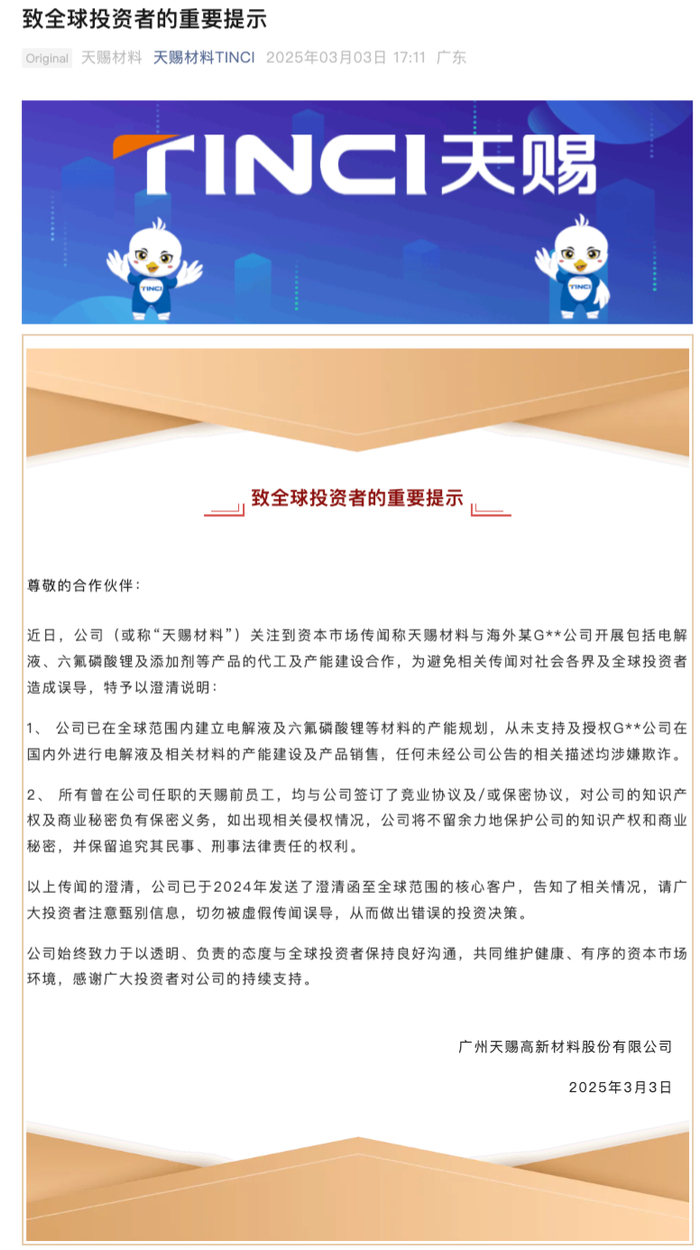 3月3日,天赐材料官微发布《致全球投资者的重要提示》,称公司已在全球范围内建立电解液及六氟磷酸锂等材料的产能规划,从未支持及授权G**公司在国内外进行电解液及相关材料的产能建设及产品销售,任何未经公司公告的相关描述均涉嫌欺诈。