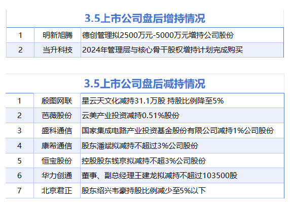 3月5日增减持汇总 媒体滚动 2025.03.05 22:40 据统计,3月5日,包括明新旭腾、当升科技在内的2家A股上市公司披露增持情况。殷图网联、芭薇股份、盛科通信、康希通信、恒宝股份、华力创通、北京君正等7家A股上市公司披露减持情况。