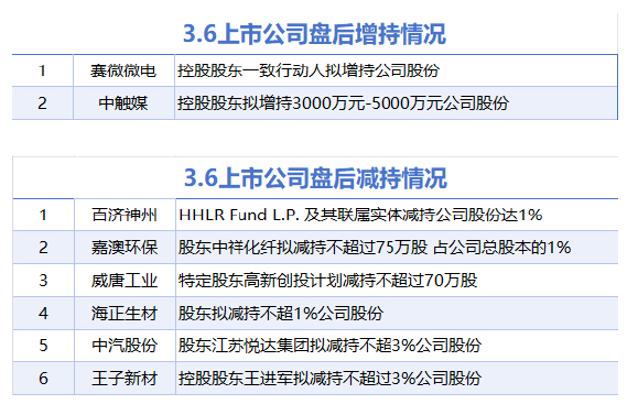 3月6日增减持汇总 媒体滚动 2025.03.06 22:05 据统计,3月6日,包括赛微微电、中触媒在内的2家A股上市公司披露增持情况。百济神州、嘉澳环保、威唐工业、海正生材、中汽股份、王子新材等6家公司披露减持情况。