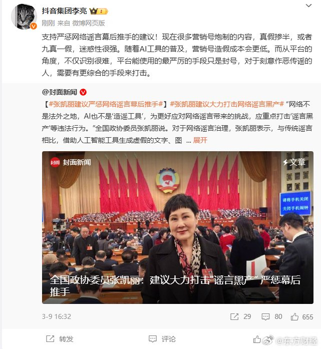 3月11日,抖音集团李亮转发张凯丽两会建议并发文称,“支持严惩网络谣言幕后推手的建议!现在很多营销号炮制的内容,真假掺半,或者九真一假,迷惑性很强。随着AI工具的普及,营销号造假成本会更低。而从平台的角度,不仅识别很难,平台能使用的最严厉的手段只是封号,对于刻意作恶传谣的人,需要有更综合的手段来打击。”