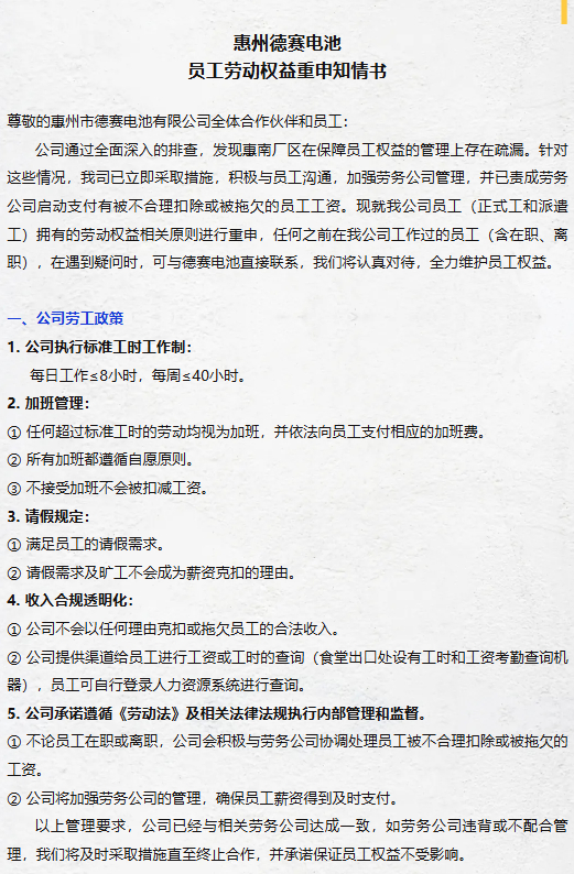 3月12日,惠州德赛电池发布员工劳动权益重申知情书,就此前“小伙上满8小时班被倒扣3天工资”一事进行回应: 公司通过全面深入的排查,发现惠南厂区在保障员工权益的管理上存在疏漏。针对这些情况,我司已立即采取措施,积极与员工沟通,加强劳务公司管理,并已责成劳务公司启动支付有被不合理扣除或被拖欠的员工工资。现就我公司员工(正式工和派遣工)拥有的劳动权益相关原则进行重申,任何之前在我公司工作过的员工(含在职、离职),在遇到疑问时,可与德赛电池直接联系,我们将认真对待,全力维护员工权益。