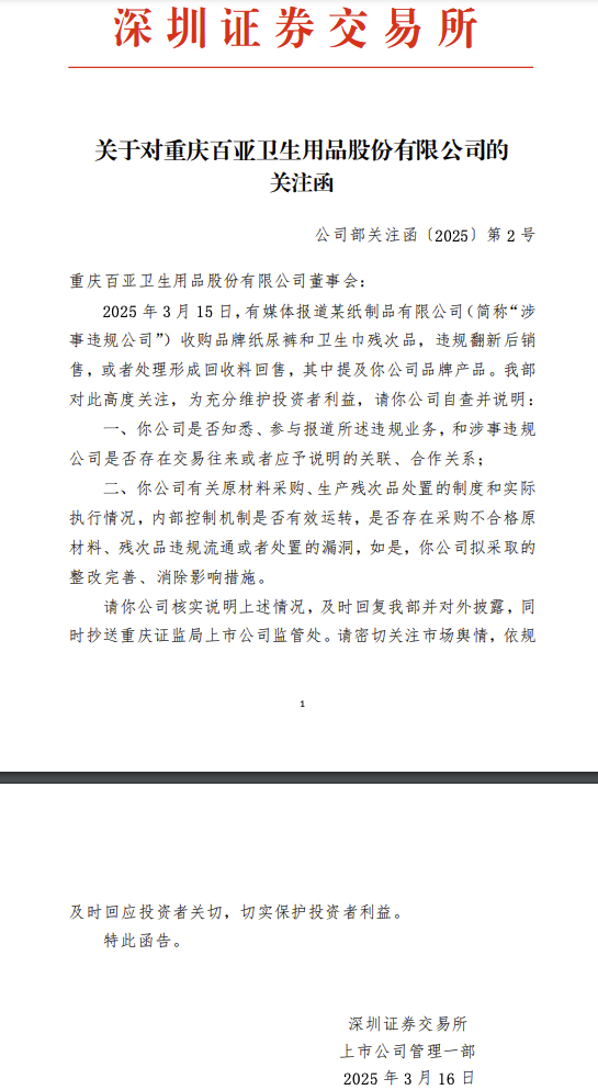 3月16日,深圳证券交易所上市公司管理一部向百亚股份下发关注函,要求公司自查并说明:公司是否知悉、参与报道所述违规业务,和涉事违规公司是否存在交易往来或者应予说明的关联、合作关系;公司有关原材料采购、生产残次品处置的制度和实际执行情况,内部控制机制是否有效运转,是否存在采购不合格原材料、残次品违规流通或者处置的漏洞,如是,公司拟采取的整改完善、消除影响措施。