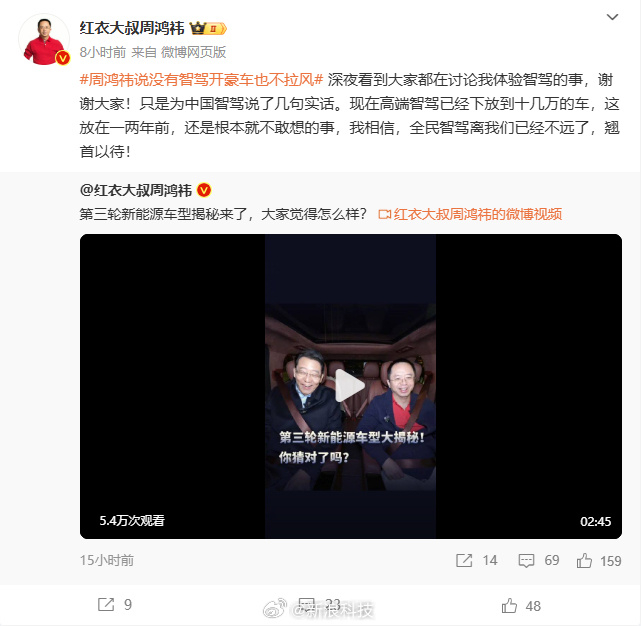 360集团创始人、董事长周鸿祎在微博转发试乘视频并发文称,现在高端智驾已经下放到十几万的车,这放在一两年前,还是根本就不敢想的事,我相信,全民智驾离我们已经不远了。