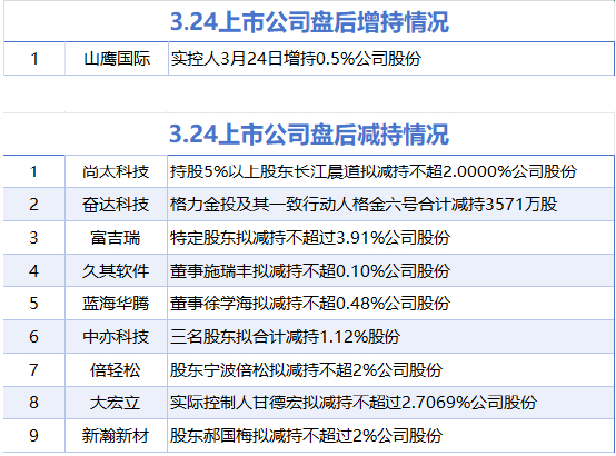 3月24日增减持汇总 媒体滚动 2025.03.24 22:16 据统计,3月24日,截至发稿前,盘后山鹰国际披露增持情况。尚太科技、奋达科技、富吉瑞、久其软件、蓝海华腾、中亦科技、倍轻松、大宏立、新瀚新材等9家A股上市公司披露拟减持情况。
