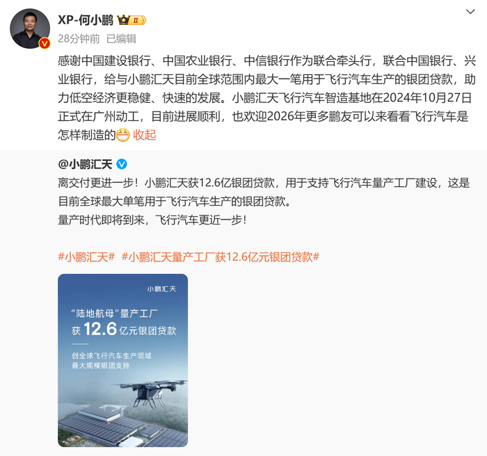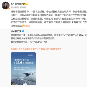 今日,小鹏汇天官方发布信息,称获12.6亿银团贷款,用于支持飞行汽车量产工厂建设,这是目前全球最大单笔用于飞行汽车生产的银团贷款。何小鹏转发后表示:感谢中国建设银行、中国农业银行、中信银行作为联合牵头行,联合中国银行、兴业银行,给与小鹏汇天目前全球范围内最大一笔用于飞行汽车生产的银团贷款,助力低空经济更稳健、快速的发展。小鹏汇天飞行汽车智造基地在2024年10月27日正式在广州动工,目前进展顺利,也欢迎2026年更多鹏友可以来看看飞行汽车是怎样制造的。(新浪科技)