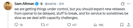 OpenAI创始人奥特曼表示,可以预期OpenAI的新版本发布将被推迟。