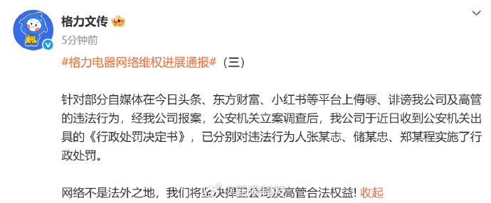 格力电器文化传媒中心官号格力文传发文称,“针对部分自媒体在今日头条、东方财富、小红书等平台上侮辱、诽谤我公司及高管的违法行为,经我公司报案,公安机关立案调查后,我公司于近日收到公安机关出具的《行政处罚决定书》,已分别对违法行为人张某志、储某忠、郑某程实施了行政处罚。网络不是法外之地,我们将坚决捍卫公司及高管合法权益。”