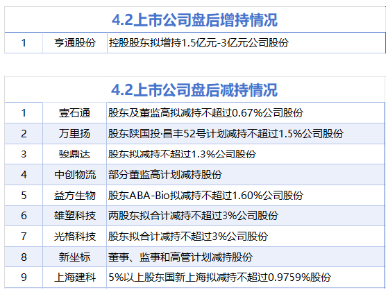 4月2日增减持汇总 媒体滚动 2025.04.02 22:21 据统计,4月2日,盘后亨通股份披露增持情况。壹石通、万里扬、骏鼎达、中创物流、益方生物、雄塑科技、光格科技、新坐标、上海建科等9家A股上市公司披露减持情况。