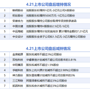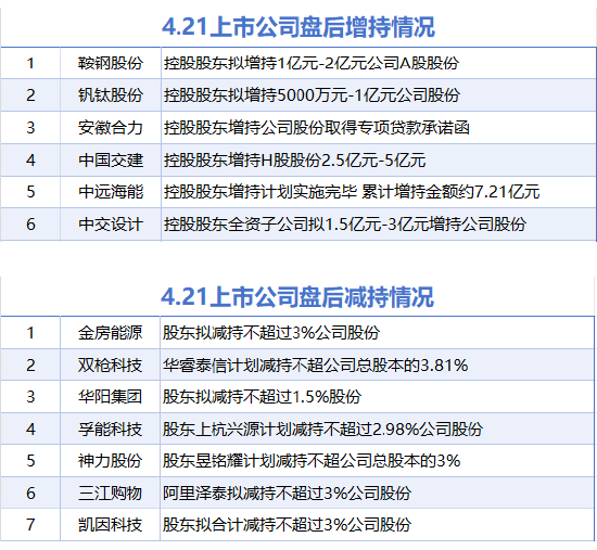 据统计,4月21日,截至发稿前,鞍钢股份、钒钛股份、安徽合力、中国交建、中远海能、中交设计等6家A股上市公司披露增持情况。金房能源、双枪科技、华阳集团、孚能科技、神力股份、三江购物、凯因科技等7家公司披露减持情况。