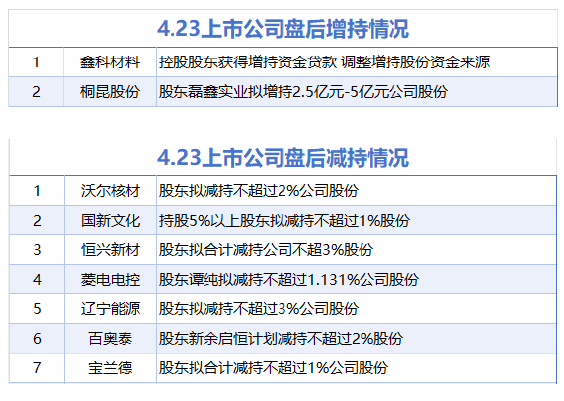 4月23日增减持汇总 滚动播报 2025.04.23 22:03 据统计,4月23日,截至发稿前,鑫科材料、桐昆股份等2家A股上市公司披露增持情况。沃尔核材、国新文化、恒兴新材、菱电电控、辽宁能源、百奥泰、宝兰德等7家公司披露减持情况。