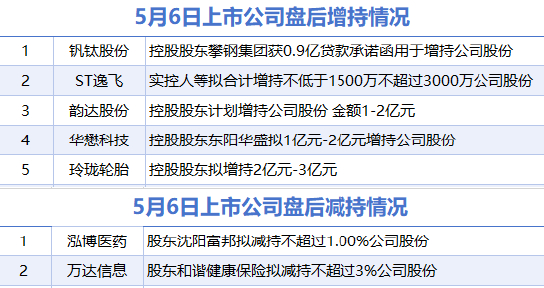 5月6日增减持汇总 滚动播报 2025.05.06 22:01 据统计,5月6日,盘后包括钒钛股份、ST逸飞、韵达股份、华懋科技、玲珑轮胎在内的5家上市公司披露增持情况。泓博医药、万达信息等2家公司披露减持情况。