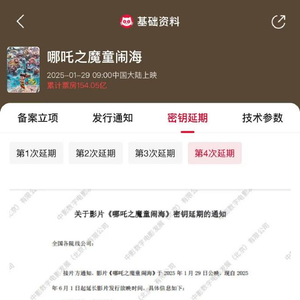 据猫眼专业版数据,电影《哪吒之魔童闹海》密钥延期,延长上映至6月30日,截至当前累计总票房154.05亿。