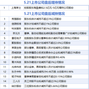 据统计,5月21日,盘后上海莱士披露增持情况。包括秀强股份、信测标准、特发服务、京北方、景旺电子、聚胶股份、莱茵生物、西域旅游、长信科技、青木科技、光库科技、东方中科、三人行、矩子科技、纳尔股份、青云科技、浪莎股份、德龙激光、王子新材、四川黄金、百合股份、栖霞建设在内的22家上市公司披露减持情况。