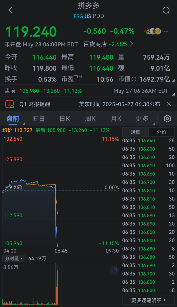 拼多多美股盘前跳水,现跌超10%。消息面上,该公司第一季度营收不及市场预期。