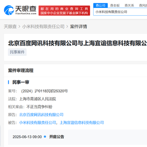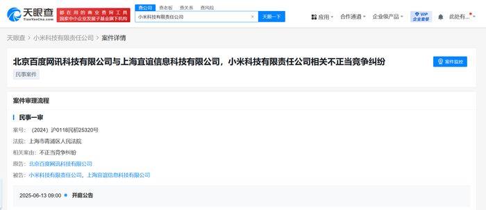 天眼查法律诉讼信息显示,近日,北京百度网讯科技有限公司与上海宜谊信息科技有限公司、小米科技有限责任公司相关不正当竞争纠纷案件新增开庭公告,原告为北京百度网讯科技有限公司,该案件将于6月13日在上海市青浦区人民法院开庭审理。