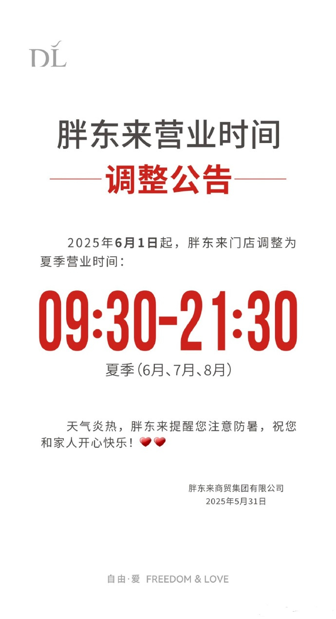 胖东来商贸集团有限公司发布公告,6月1日起,胖东来门店调整为夏季营业时间9:30~21:30。