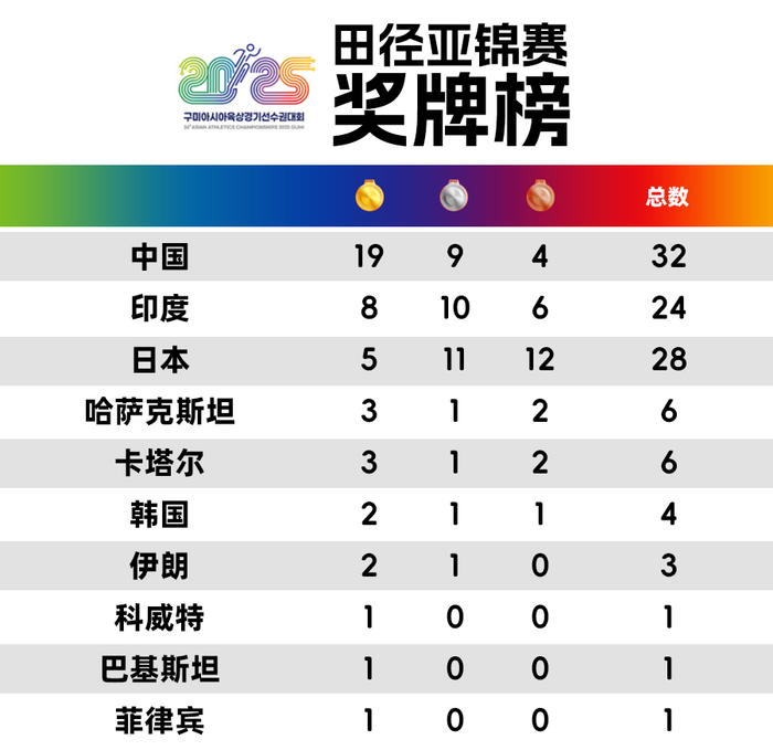 高居榜首 田径亚锦赛中国队19金牌收官 滚动播报 2025.06.01 00:18 北京时间5月31日,2025年亚洲田径锦标赛在韩国龟尾落下帷幕。中国队以19金9银4铜,总计32枚奖牌的成绩,位居榜首。(央视新闻)