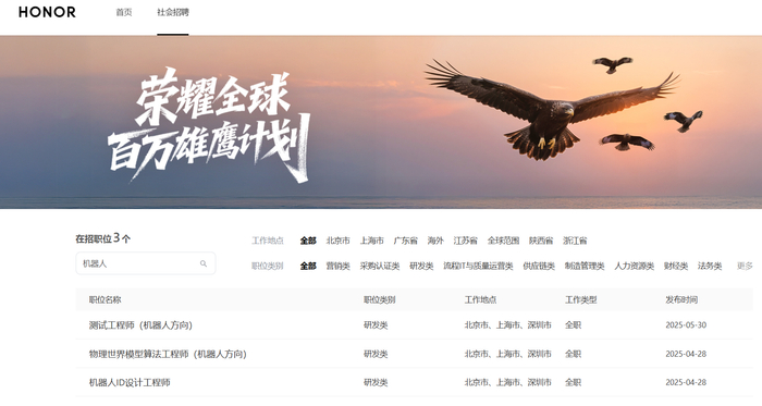 荣耀开放多个机器人相关岗位招聘 滚动播报 2025.06.05 17:47 荣耀官网近期发布多个机器人相关研发岗位招聘计划,包括机器人具身大模型与数据算法工程师、机器人软件系统开发工程师、测试工程师(机器人方向)、灵巧手设计工程师等岗位。