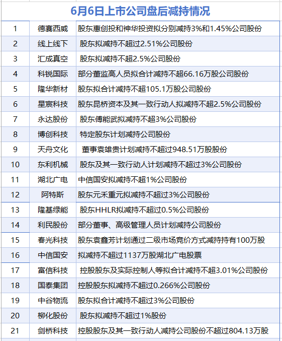 据统计,6月6日,盘后德赛西威、线上线下、汇成真空、科锐国际、隆华新材、星宸科技、永达股份、博创科技、天舟文化、东利机械、湖北广电、阿特斯、隆基绿能、利民股份、春光科技、中信国安、富信科技、国泰集团、中谷物流、柳化股份、剑桥科技等21家上市公司披露减持情况。当日暂无上市公司披露增持情况。
