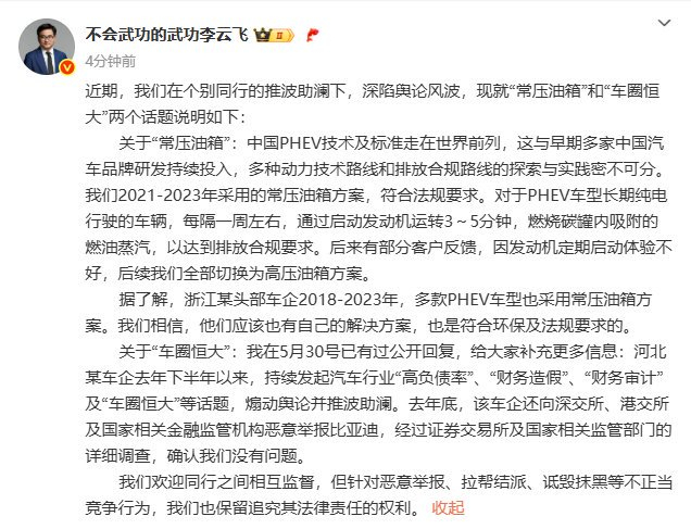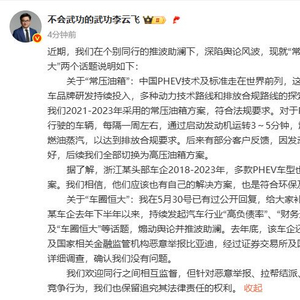 6月8日,针对近期常被提起的“常压油箱”事件和车圈“恒大”争议,比亚迪品牌及公关总经理李云飞首次公开回应,不过微博内容仅存在6小时左右,当晚该条回应就被删除,此举也引发市场热议。据知情人士透露,该微博是当日李云飞出差前发出,待航班落地后,比亚迪董事长王传福与其通话,要求“忍一时,和为贵”,因此李云飞按照要求删除微博,但微博内容全部属实。 虽然该条微博存在仅约6小时,但其传播量不容小觑。有网友统计,自微博发布至下午5点,该微博获1.3万赞,4000多次转发,相较以往相同时间内的获赞和转发,此条微博更受重视。微博中,李云飞表示,比亚迪在2021年至2023年采用的常压油箱方案是符合法规要求的。