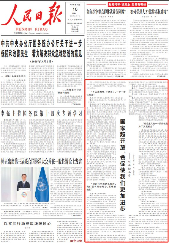 近日,在深圳华为总部,围绕大众关心的一些热点话题,人民日报记者一行与华为首席执行官任正非面对面交流。任正非表示,国家越来越开放,开放会促使我们更加进步。国家在党的领导下,行政上是统一的,政令是通达的,逐步形成统一的大市场是可能的,一定会突破所有的封锁,实现伟大的复兴。(人民日报)