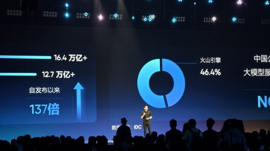 今日举办的火山引擎FORCE原动力大会现场,火山引擎总裁谭待表示,截至今年5月底,火山引擎豆包大模型tokens日均调用量已经达到16.4万亿,是发布时的137倍。根据IDC市场数据,火山引擎占据46.4%的市场份额。(新浪科技)