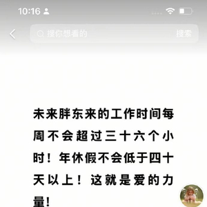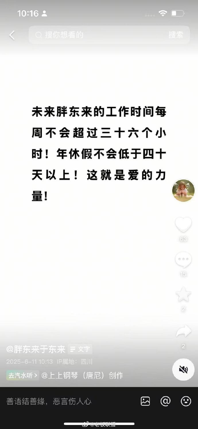 于东来:胖东来每周工作时间将不超过36小时,年休假将不低于40天 滚动播报 2025.06.11 10:34 6月11日,胖东来创始人于东来发文表示:未来胖东来的工作时间每周不会超过三十六个小时,年休假不会低于四十天以上。 责任编辑:于健 SF069