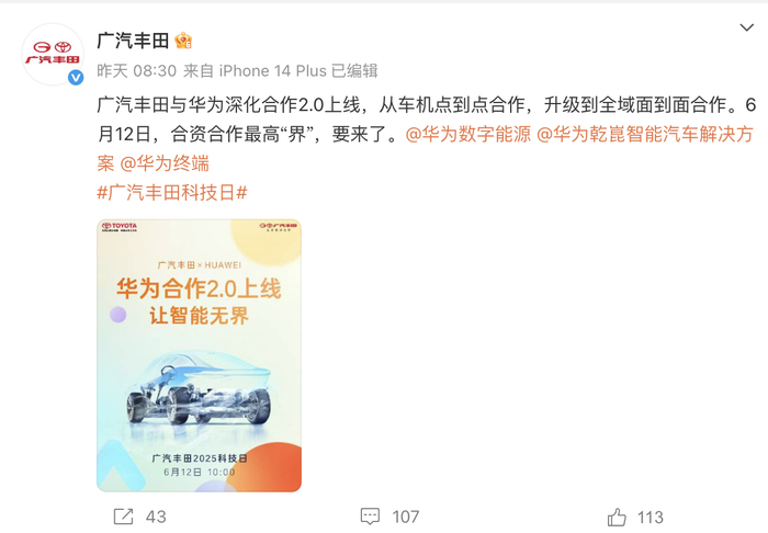 广汽丰田宣布与华为合作 滚动播报 2025.06.12 14:09 广汽丰田官方微博发布信息称,广汽丰田与华为深化合作2.0上线,从车机点到点合作,升级到全域面到面合作。6月12日,合资合作最高“界”要来了。